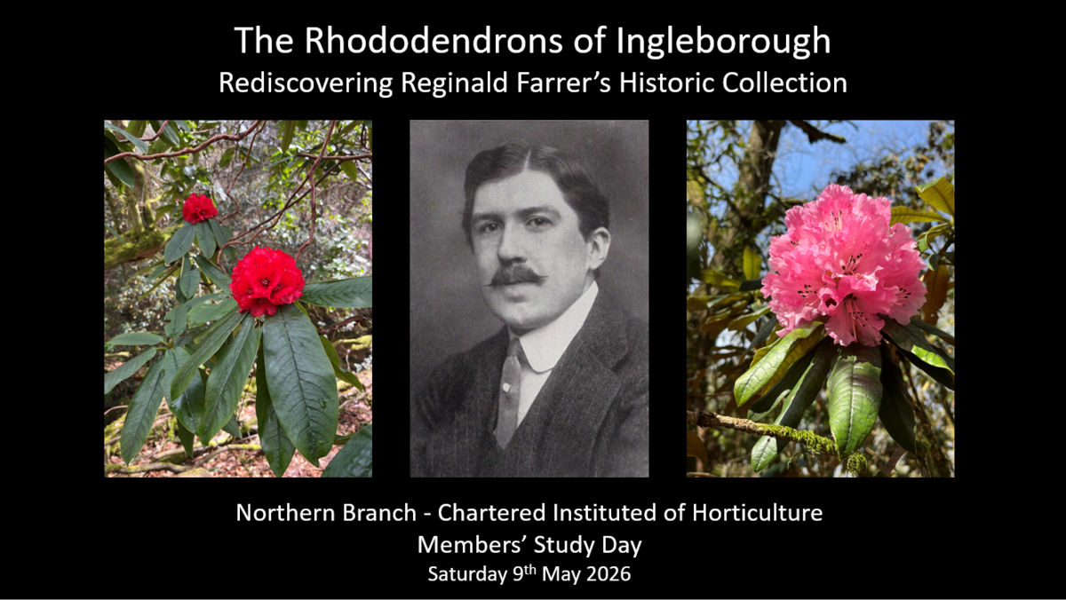 A talk followed by a tour of the rhododendrons on the Ingleborough Estate Nature Trail, with Andrew Jarman, Managing Director of the Ingleborough Nature Trail, and Trevor Nicholson, CIH Member and Head of Gardens & Grounds at Harewood House. The talk will cover the life and work of Reginald Farrer, with an emphasis on the rhododendrons he planted on the estate.